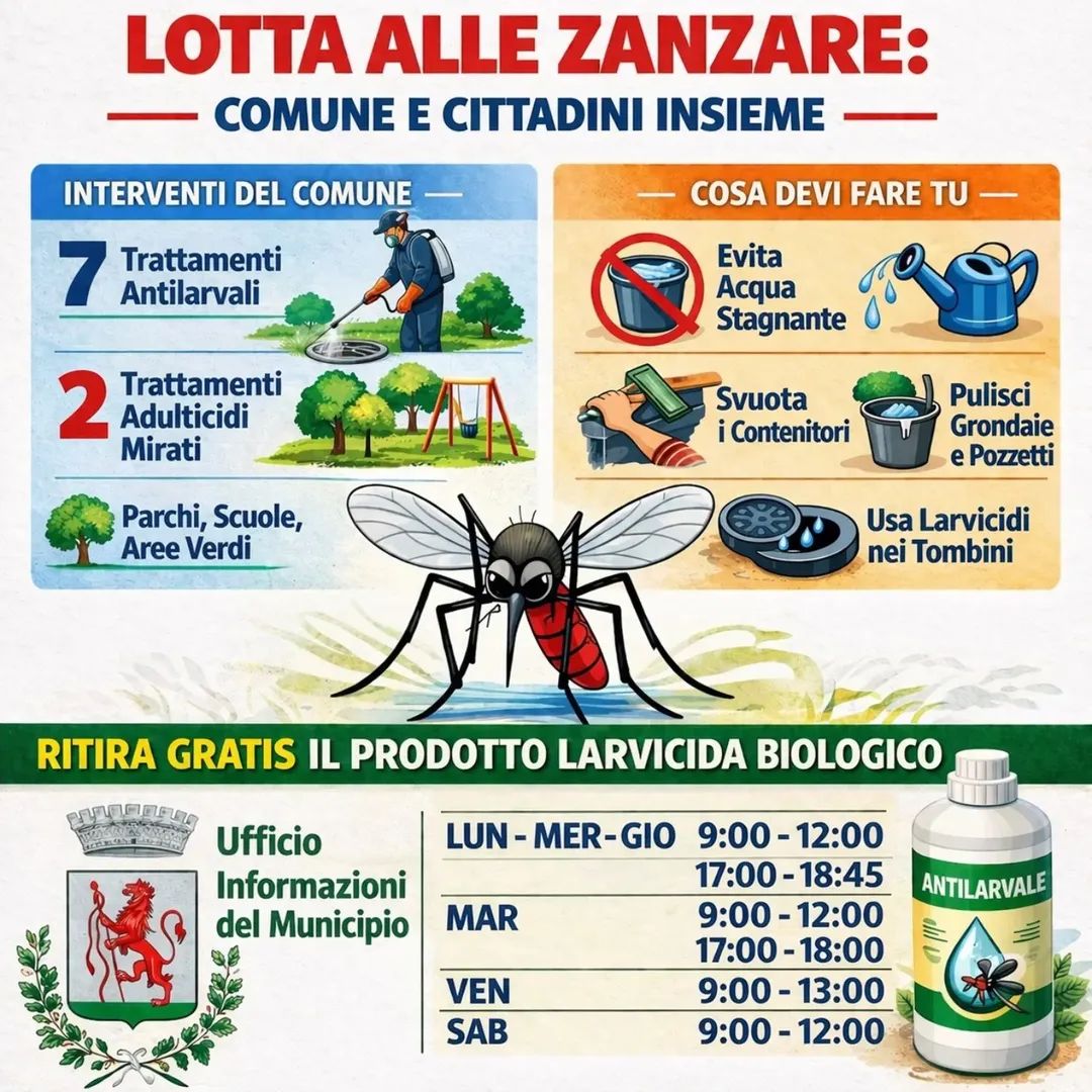 E’ possibile RITIRARE GRATIS IL PRODOTTO ANTILARVALE presso l’Ufficio Informazioni del Municipio (piano terra) nei seguenti orari: Lun, Mer, Gio: 9:00-12:00 / 17:00-18:45, Mar: 9:00-12:00 / 17:00-18:00, Ven: 9:00-13:00, Sab: 9:00-12:00