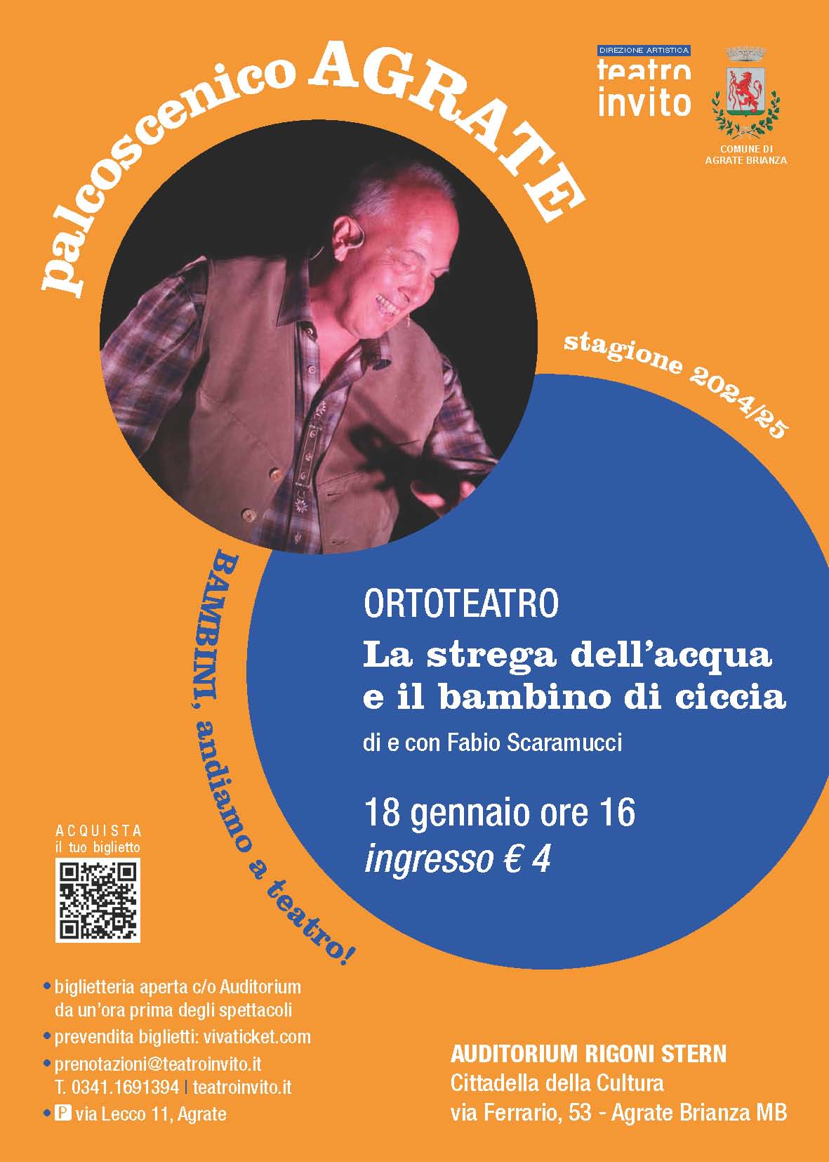 In questo spettacolo, che prosegue il percorso sull’arte del contastorie intrapreso da Fabio Scaramucci, si racconta la storia della bella Caterina e del perché le misteriose Agane sono entrate nei corsi d’acqua; la storia del giovane Tarcisio che si innamora di una donna un po’ speciale; del piccolo Martino che si imbatte in una strega/agana che trasforma i bambini in coniglietti. E poi ci sono gli Orcul, il Mazzarot, e tutte le atmosfere antiche di quando l’ascoltare una storia era magia, paura e gran divertimento. Come allora, quando nelle stalle si riunivano le famiglie per ascoltare i vecchi narratori, il contastorie di oggi saprà coinvolgere il pubblico di tutte le età.